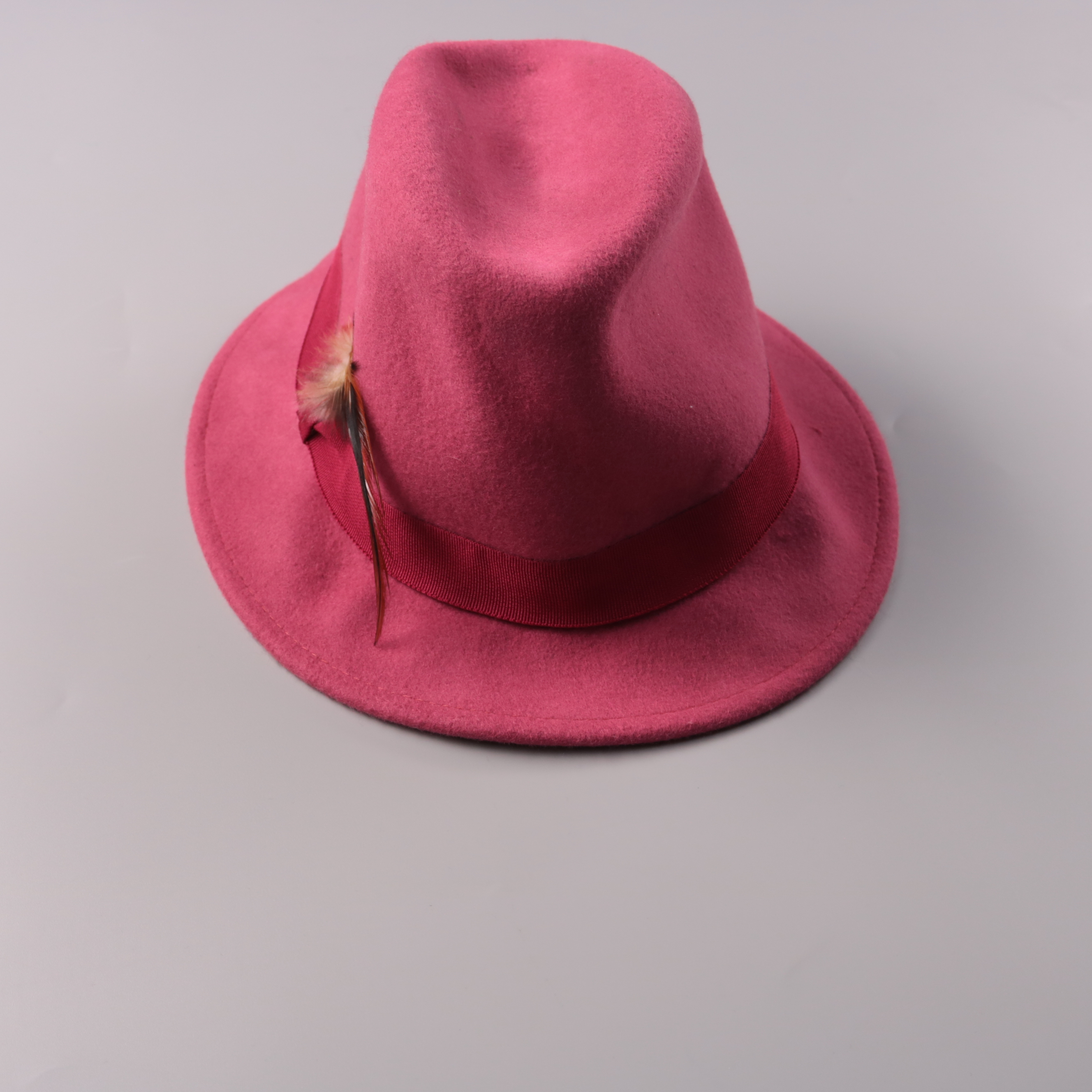 Фетровая шляпа Bershka в розовом цвете, с лентой в тон и декоративным пером. Подойдёт для прогулок и образов в стиле casual/винтаж в прохладную погоду. Держит форму и хорошо защищает от ветра.