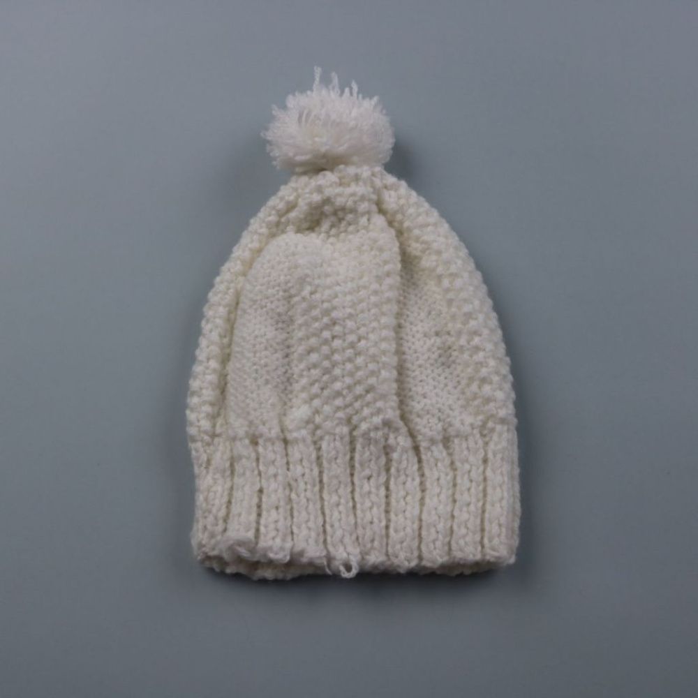 Вязаная зимняя шапка-бини без бренда, молочного цвета, с помпоном и фактурной вязкой. Подойдёт для повседневной носки в холодную погоду и легко сочетается с верхней одеждой в нейтральных тонах. Хорошо держит тепло и плотно сидит за счёт эластичной рези...