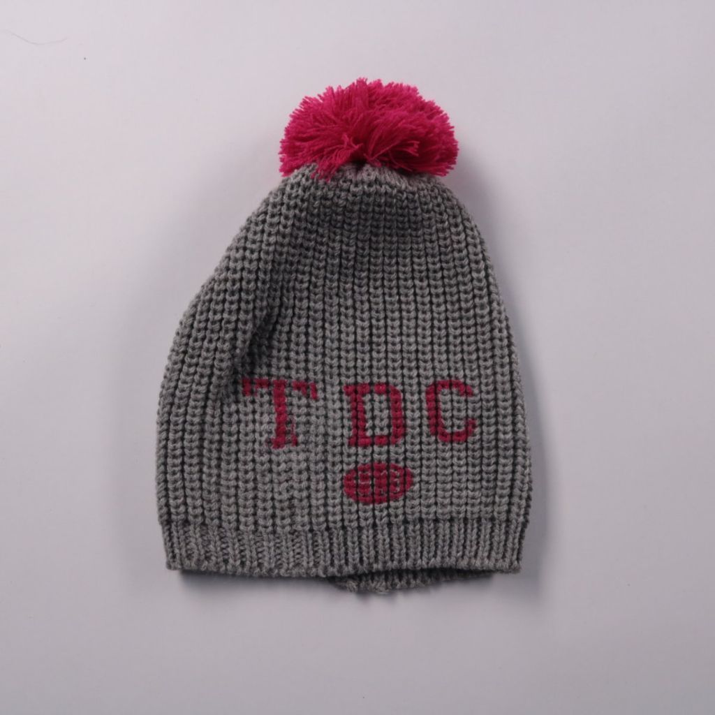 Вязаная шапка-бини с помпоном и контрастным рисунком/надписью. Подойдёт для повседневных прогулок и поездок в холодную погоду. Плотная вязка хорошо держит форму и защищает от ветра.