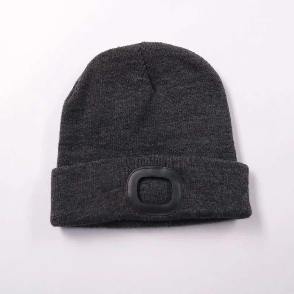 Вязаная шапка KINGCRAFT тёмно-серого цвета с отворотом и съёмным LED-фонариком спереди. Подойдёт для зимних прогулок и дороги в тёмное время суток. Практичное преимущество — LED-модуль можно снять перед стиркой.
