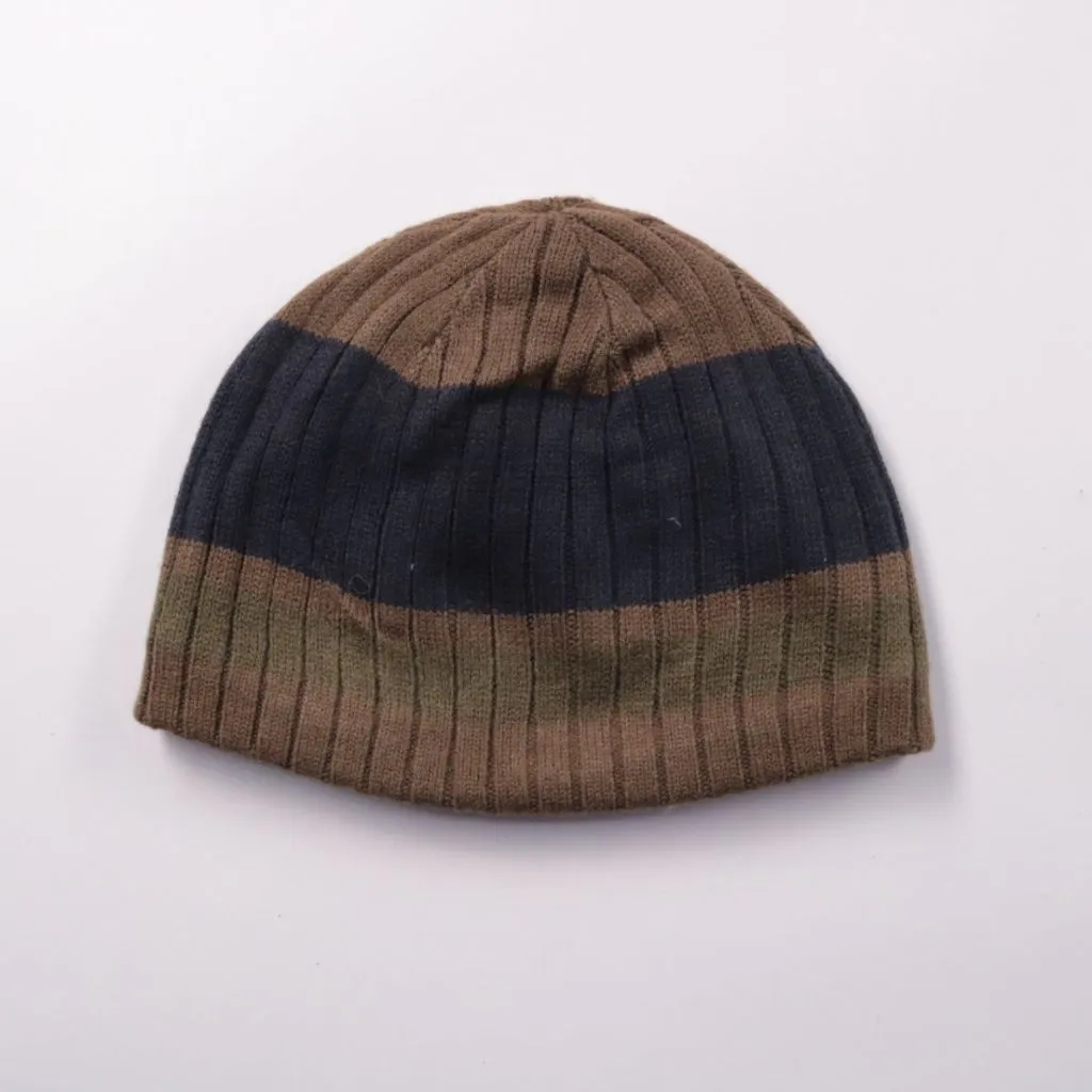 Вязаная шапка TCM в рубчик с полосатым рисунком в коричнево-сине-зелёной гамме. Подойдёт для повседневной носки в холодную погоду и на демисезон. Хлопковая подкладка делает посадку мягче и комфортнее.