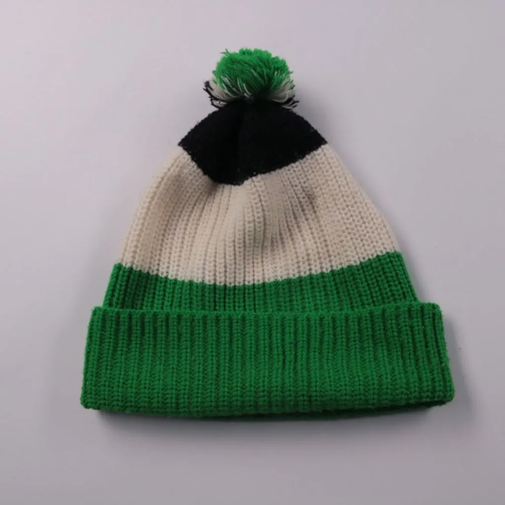 Вязаная шапка-бини с помпоном, без указания бренда, в полоску зелёного, белого и чёрного цветов. Подойдёт для повседневной носки в холодную погоду и прогулок. Мягкий трикотаж хорошо тянется и удобно садится по голове.