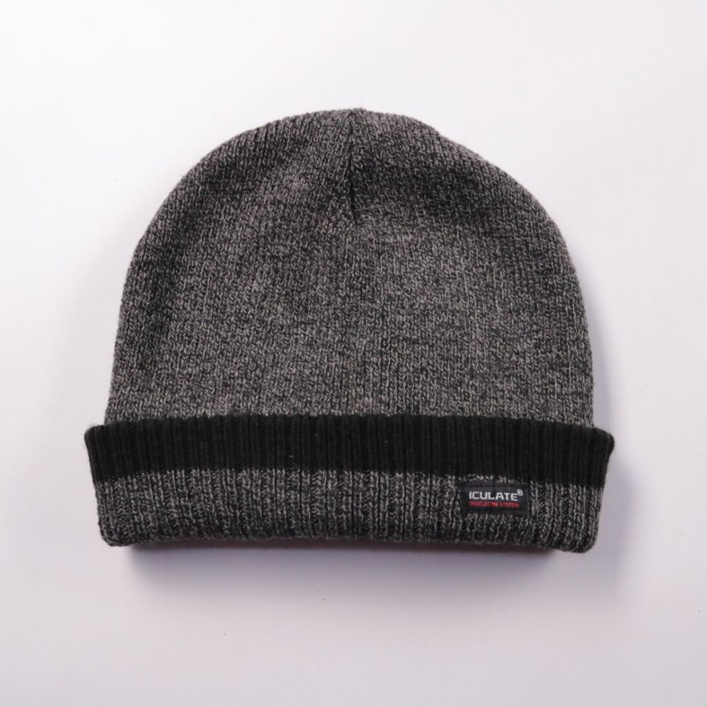Вязаная шапка Iculate серого меланжа с чёрным отворотом и нашивкой на манжете. Подойдёт для повседневной носки в холодную погоду и прогулок на улице. Тёплая подкладка из полиэстера помогает лучше удерживать тепло.