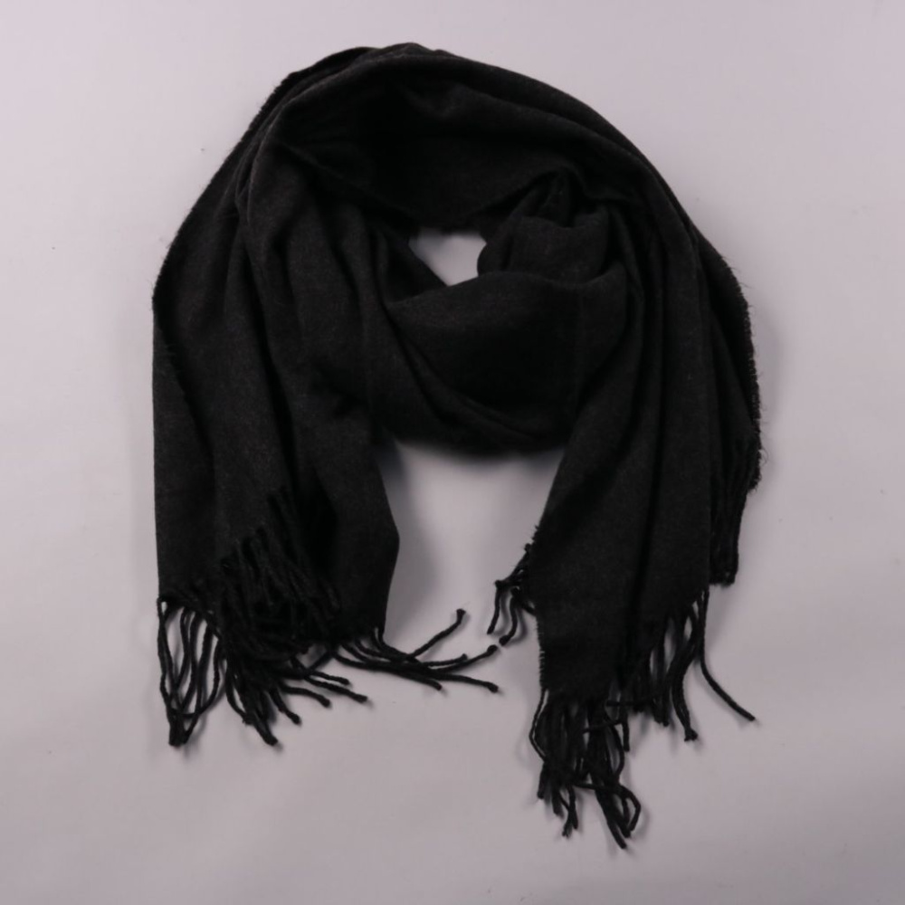 Чёрный шарф с бахромой, мягкий и объёмный. Подойдёт для повседневных образов в прохладную погоду, удобно носить с пальто или курткой. Практичное преимущество — легко драпируется и добавляет тепла без лишнего объёма.