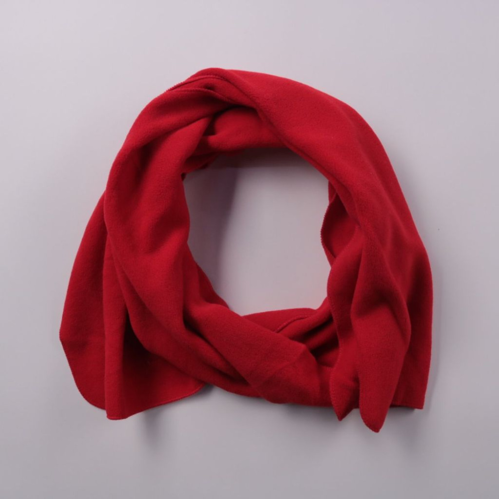 Тёплый красный флисовый шарф без указанного бренда. Подойдёт для прогулок и повседневной носки в холодную погоду, мягкий и комфортный к коже. Лёгкий в уходе — можно стирать при 30°C.