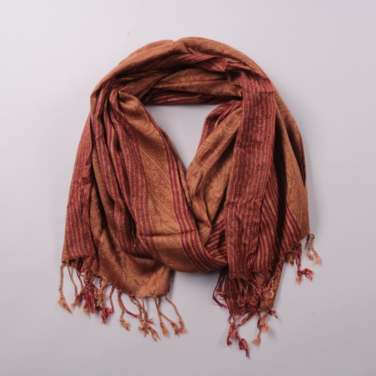 Шарф с бахромой в коричнево-бордовой гамме с полосатым узором. Подойдёт для повседневных образов и поездок, можно носить на шее или накидывать на плечи. Лёгкий и компактно складывается, удобно брать с собой.