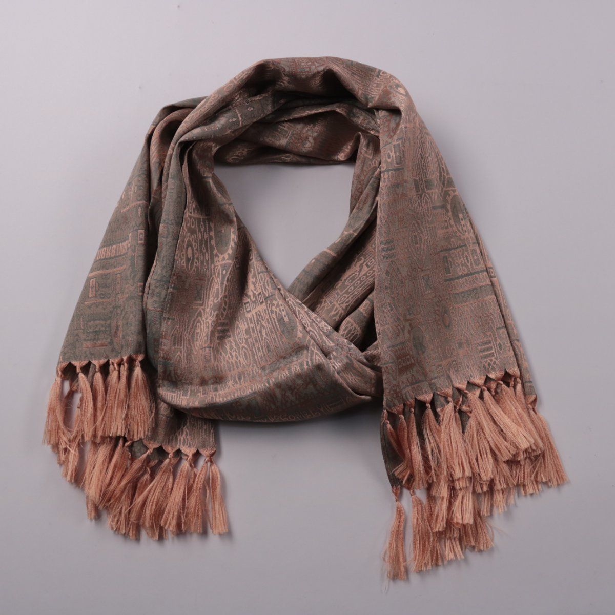 Шарф New Apple Thai Silk с жаккардовым узором и кистями по краям. Подойдёт для повседневных образов и в поездки, чтобы добавить акцент к однотонной одежде. Лёгкий и компактно складывается, удобно носить с собой.