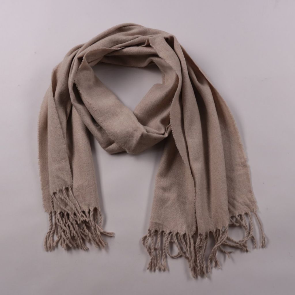 Однотонный бежевый шарф с бахромой, мягкий на ощупь. Подойдёт для повседневных образов в прохладную погоду и как аккуратный акцент к пальто или куртке. Практичен тем, что легко сочетается с разной одеждой и компактно складывается.