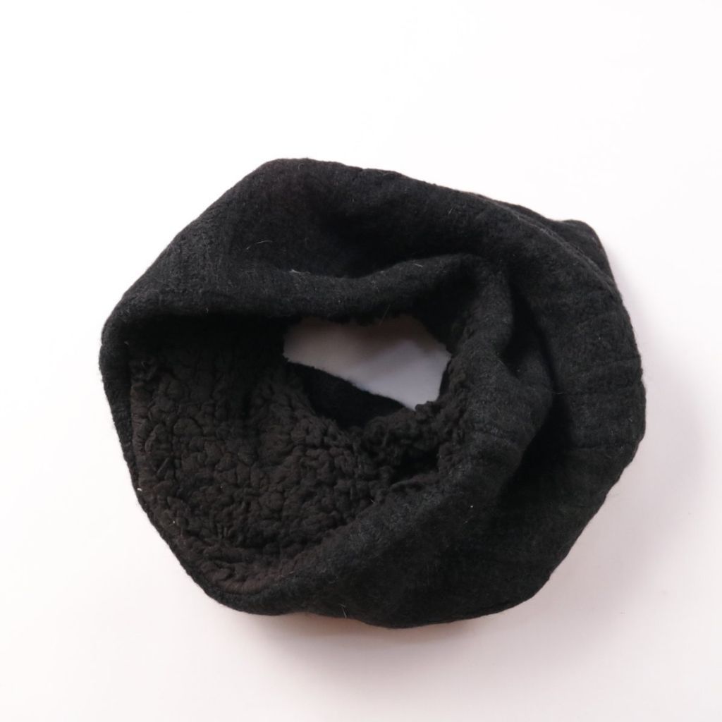 Чёрный снуд без бренда, выполнен из плотного мягкого материала с тёплой фактурной внутренней стороной. Подойдёт для зимних прогулок и поездок, защищает шею от ветра. Удобен тем, что надевается через голову и не развязывается.