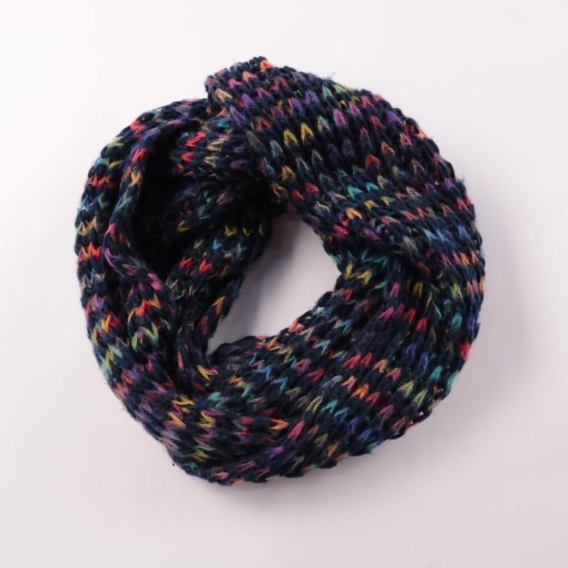 Вязаный шарф-снуд без бренда, тёмной основы с разноцветной пряжей. Подойдёт для повседневной носки в холодную погоду, хорошо защищает шею от ветра. Удобен тем, что быстро надевается и не развязывается.