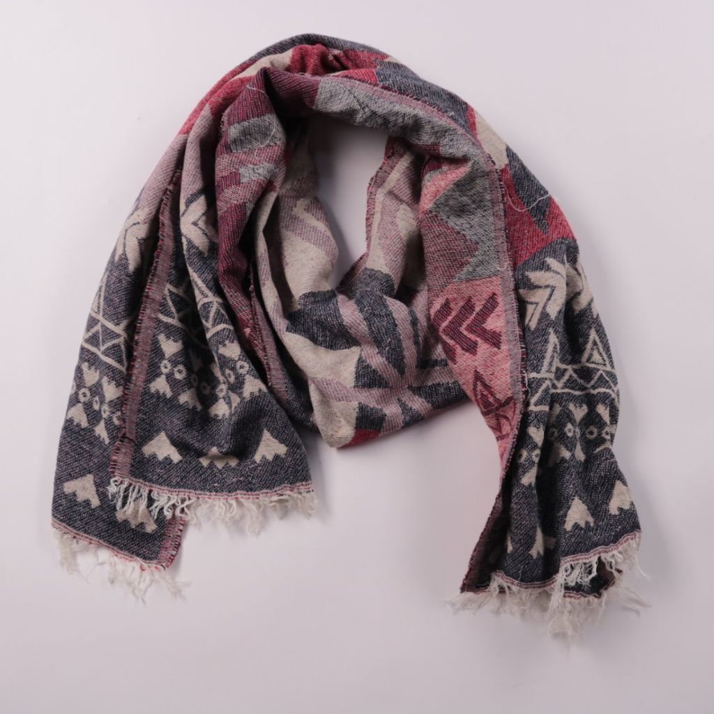 Тёплый тканый шарф с геометрическим орнаментом и короткой бахромой по краю. Подойдёт для повседневных образов в прохладную погоду и хорошо сочетается с пальто или курткой. За счёт плотной ткани помогает лучше сохранять тепло и комфортно драпируется.