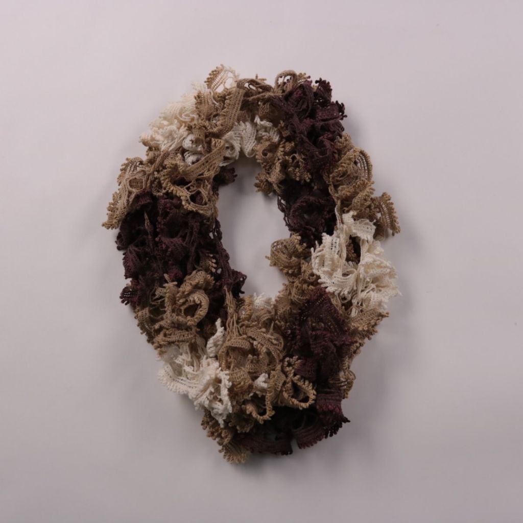 Вязаный шарф-снуд без бренда из фактурной пряжи с кружевными рюшами в бежево-коричневой гамме. Подойдёт для прогулок и повседневных образов в прохладную погоду. Удобен тем, что надевается одним движением и хорошо держится на шее без завязывания.