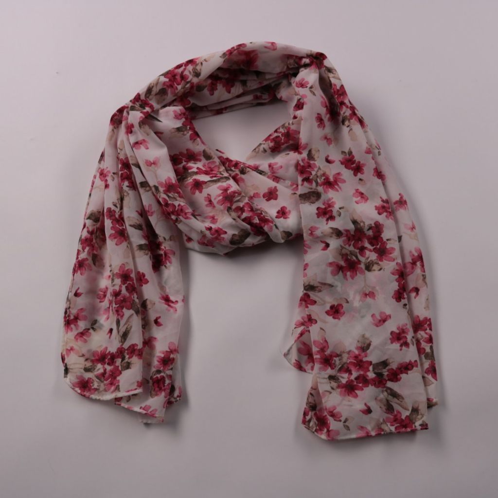 Лёгкий шарф с цветочным принтом на светлой основе, бренд не указан. Подойдёт для повседневных образов и для аккуратного акцента к однотонному пальто, жакету или платью. Тонкая ткань легко драпируется и занимает минимум места в сумке.