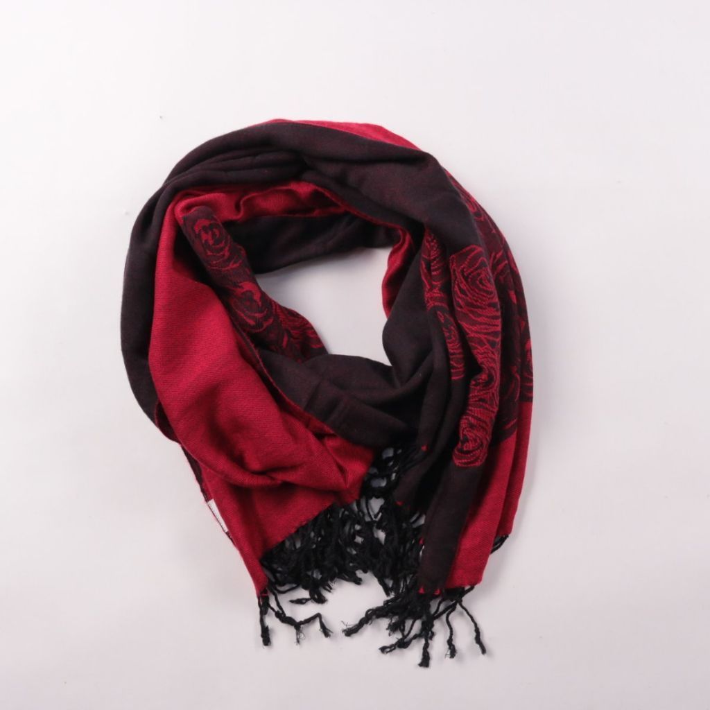 Шарф с бахромой в чёрно-бордовой гамме с цветочным узором. Подойдёт для демисезонных прогулок и в качестве акцента к однотонному пальто или куртке. Мягко драпируется и можно носить разными способами (как шарф или лёгкий палантин).