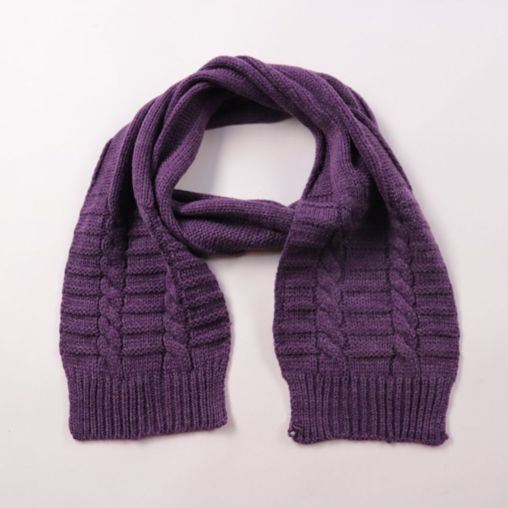 Вязаный шарф LBVYR фиолетового цвета с узором «косы» и резинкой по краям. Подойдёт для зимних прогулок и повседневной носки в холодную погоду. Хорошо сохраняет тепло и удобно драпируется.