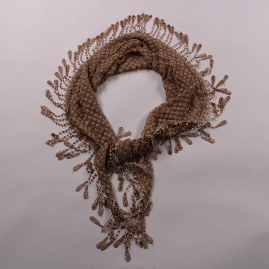Коричневый шарф-косынка с декоративной ажурной бахромой по краю. Подойдёт для образов на прохладную погоду, можно носить на шее или на плечах. Лёгкий и компактный, удобно брать с собой в сумку.