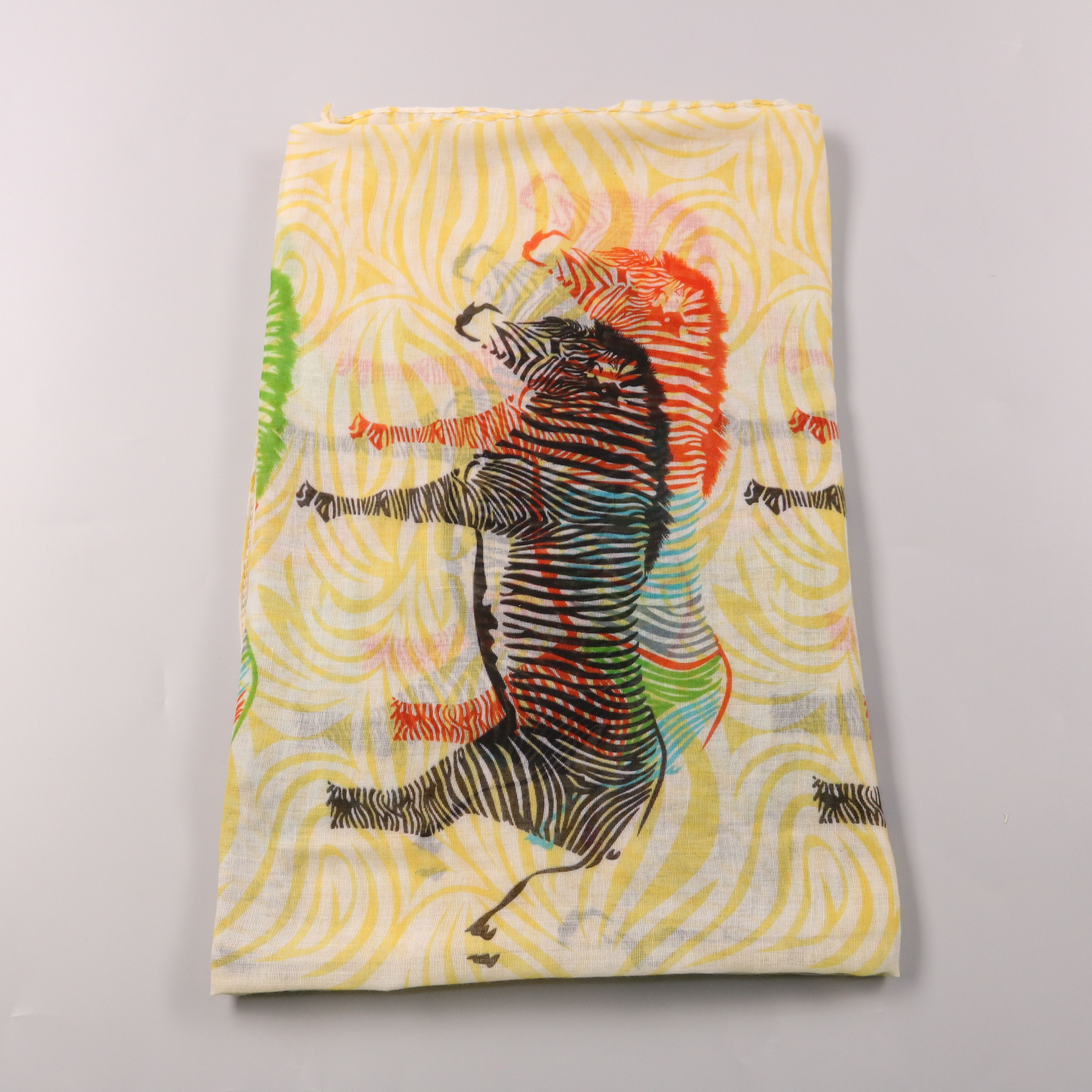 Лёгкий шарф с ярким принтом зебры и волнистым узором, бренд не указан. Подойдёт для прогулок и поездок в тёплую весну/осень или прохладные летние вечера. Тонкая ткань легко драпируется и не занимает много места в сумке.
