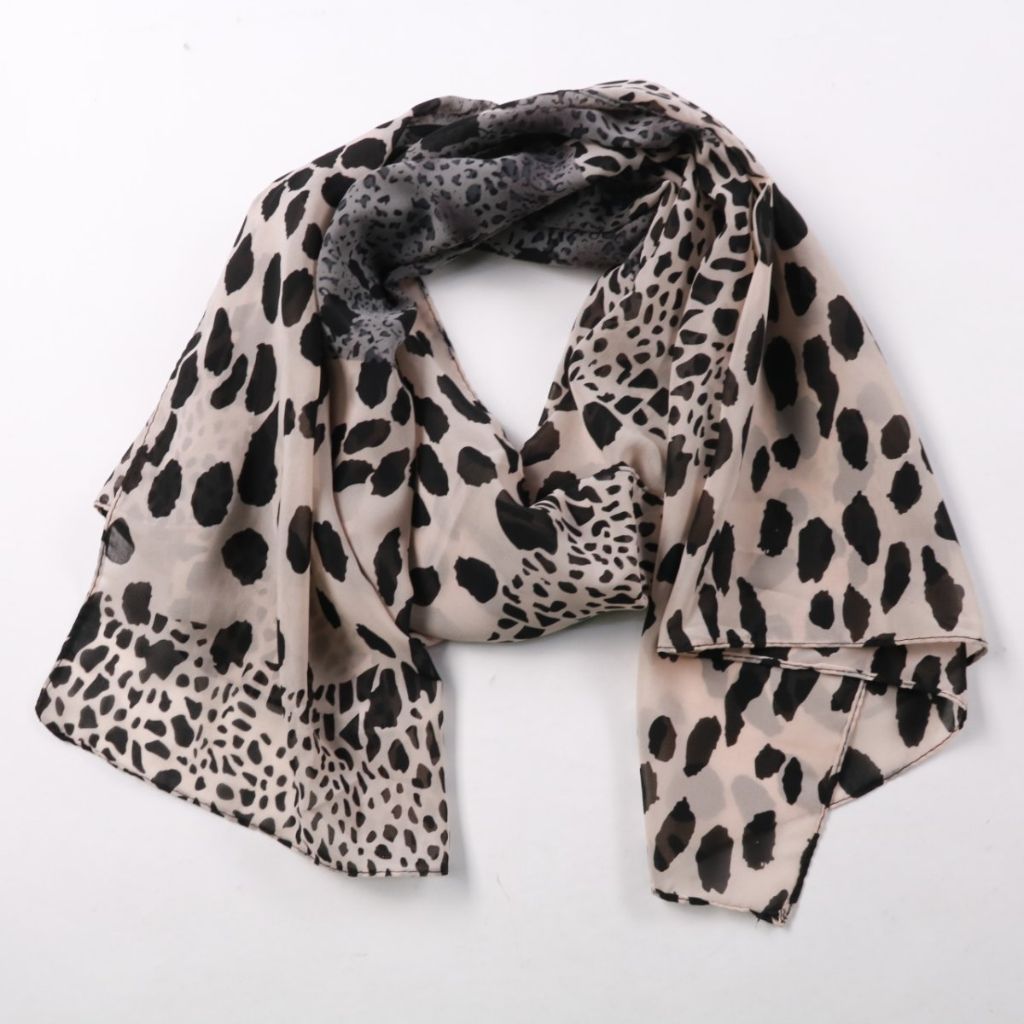 Шарф с леопардовым принтом в бежево-чёрной гамме, лёгкий и мягко драпируется. Подойдёт для повседневных образов и как акцент к однотонному пальто или куртке. Удобно носить на шее или накидывать на плечи — занимает мало места в сумке.