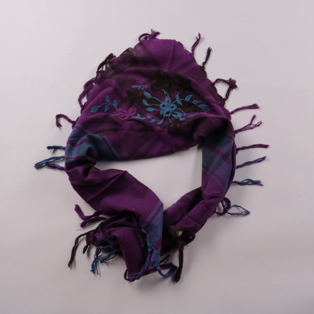 Треугольный платок с кисточками, в фиолетовой гамме с клетчатым рисунком и вышивкой. Подойдёт для повседневных образов в межсезонье и прохладным вечером. Лёгкая ткань удобно драпируется и не занимает много места в сумке.