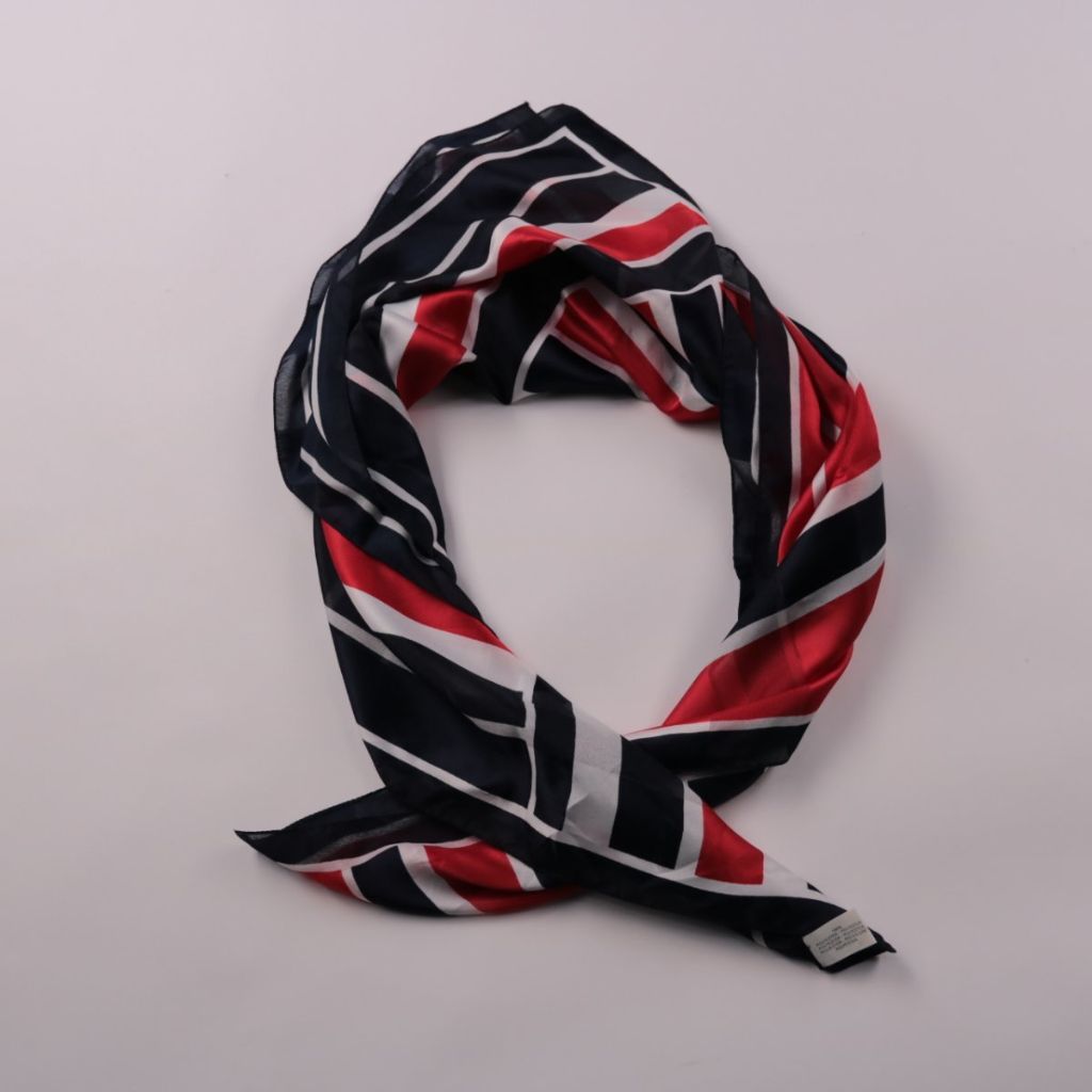 Платок из 100% полиэстера с геометрическим принтом в красно-бело-чёрной гамме. Подойдёт для повседневных образов — можно носить на шее, на голове или завязать на сумку. Лёгкий материал быстро сохнет и почти не мнётся.