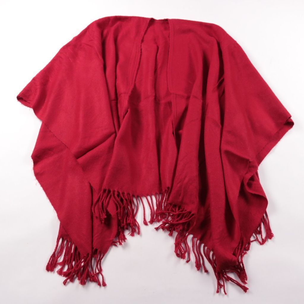 Красный палантин с бахромой, без заметного брендинга. Подойдёт для прогулок и поездок в прохладную погоду, можно носить как шарф или накидывать на плечи. Практичен тем, что легко складывается и не занимает много места в сумке.