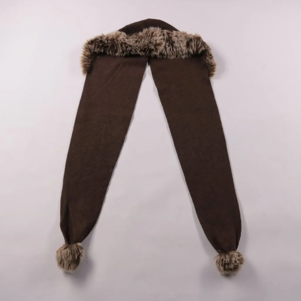 Тёплый шарф тёмно-коричневого цвета с отделкой из искусственного меха и помпонами на концах. Подойдёт для зимних прогулок и повседневной носки, добавляет образу уютный акцент. Длинные концы удобно завязывать разными способами и хорошо закрывают шею от ...