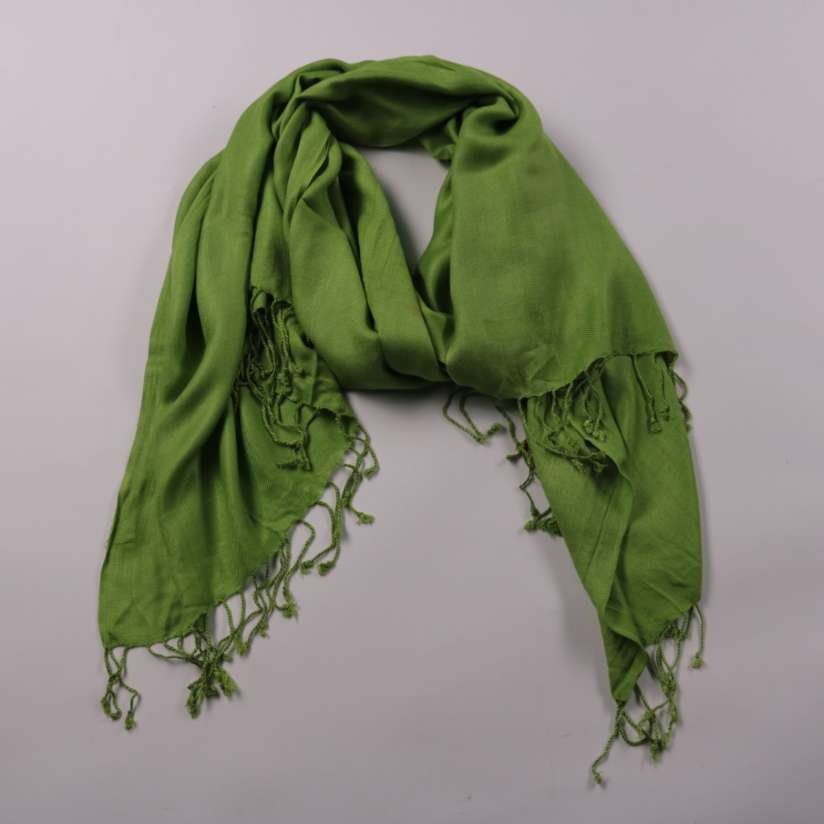 Зелёный шарф без указанного бренда, однотонный, с кисточками по краям. Подойдёт для повседневной носки и как лёгкий акцент к верхней одежде в прохладную погоду. Удобно драпируется и можно завязывать разными способами.