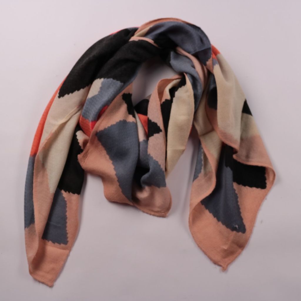 Шарф Pieces с геометрическим разноцветным принтом в оттенках бежевого, синего, чёрного и красного. Подойдёт для повседневных образов и как акцент к однотонному пальто или куртке. Лёгкий материал удобно драпируется и не занимает много места в сумке.