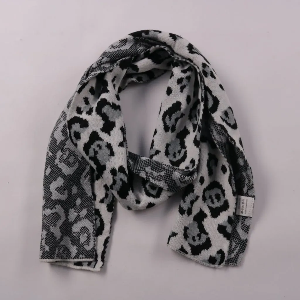 Вязаный шарф с леопардовым принтом в серо-чёрно-белой гамме. Подойдёт для повседневных образов и утепления в прохладную погоду. Акриловый состав легко стирается и быстро сохнет.