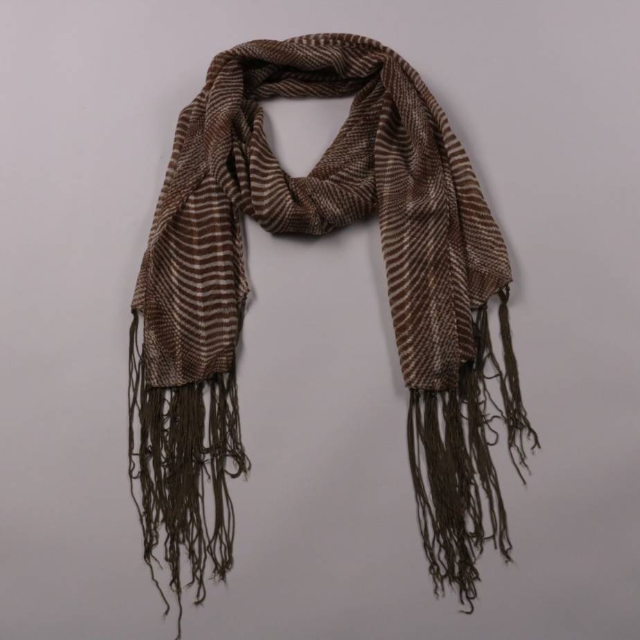 Тонкий шарф без бренда в коричневой гамме с полосатым узором и длинной бахромой. Подойдёт для повседневных образов в прохладную погоду и как акцент к однотонной верхней одежде. Лёгкий, удобно складывается и не занимает много места в сумке.