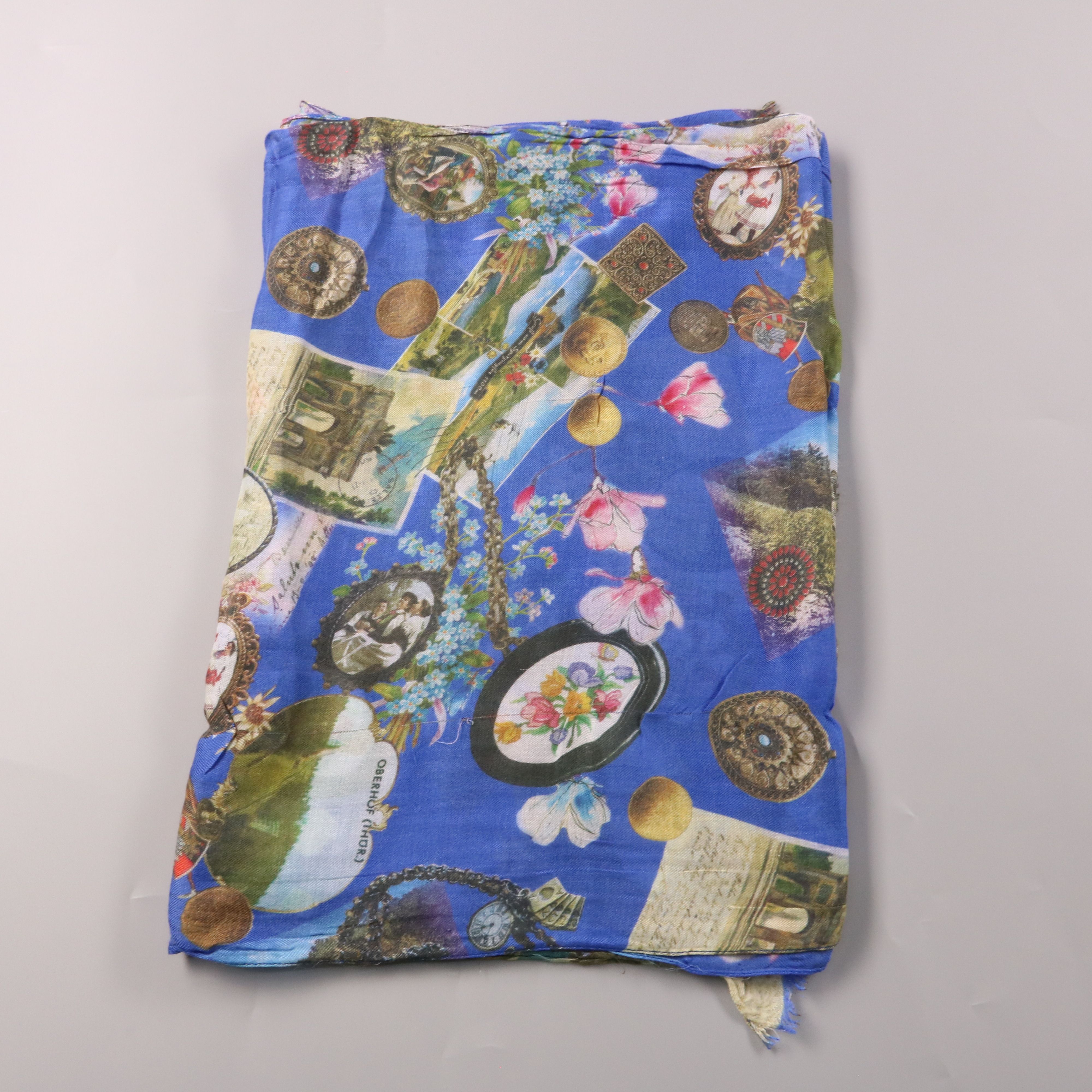 Шарф с ярким принтом на синем фоне и мягкой, лёгкой фактурой. Подойдёт для повседневных образов и как акцент к однотонной одежде в любое время года. Края с короткой бахромой, удобно драпируется и можно носить разными способами.