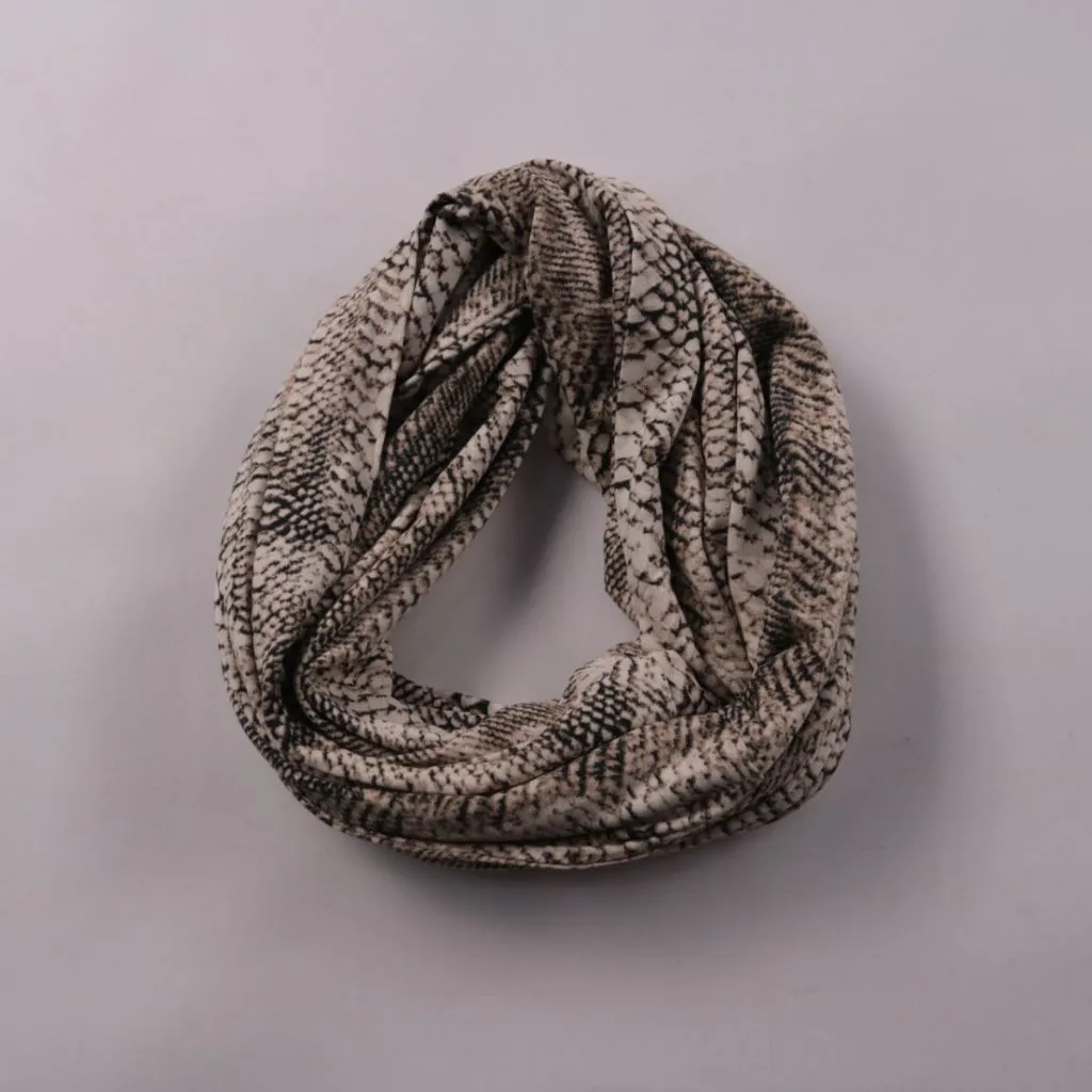 Шарф-снуд с принтом под рептилию, без указания бренда. Подойдёт для прохладной погоды и многослойных образов, удобно носить как круговой шарф. Практичен тем, что не развязывается и быстро надевается.