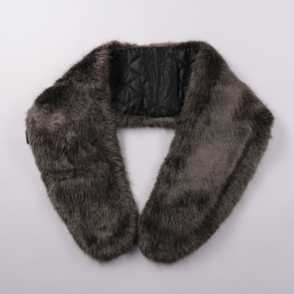Меховой воротник-накидка из искусственного меха в тёмно-сером оттенке, с простёганной подкладкой. Подойдёт для пальто и курток в холодный сезон, добавляя объём и тепло в зоне шеи. Практичный вариант: легко очищается (wipe clean) и не требует сложного у...