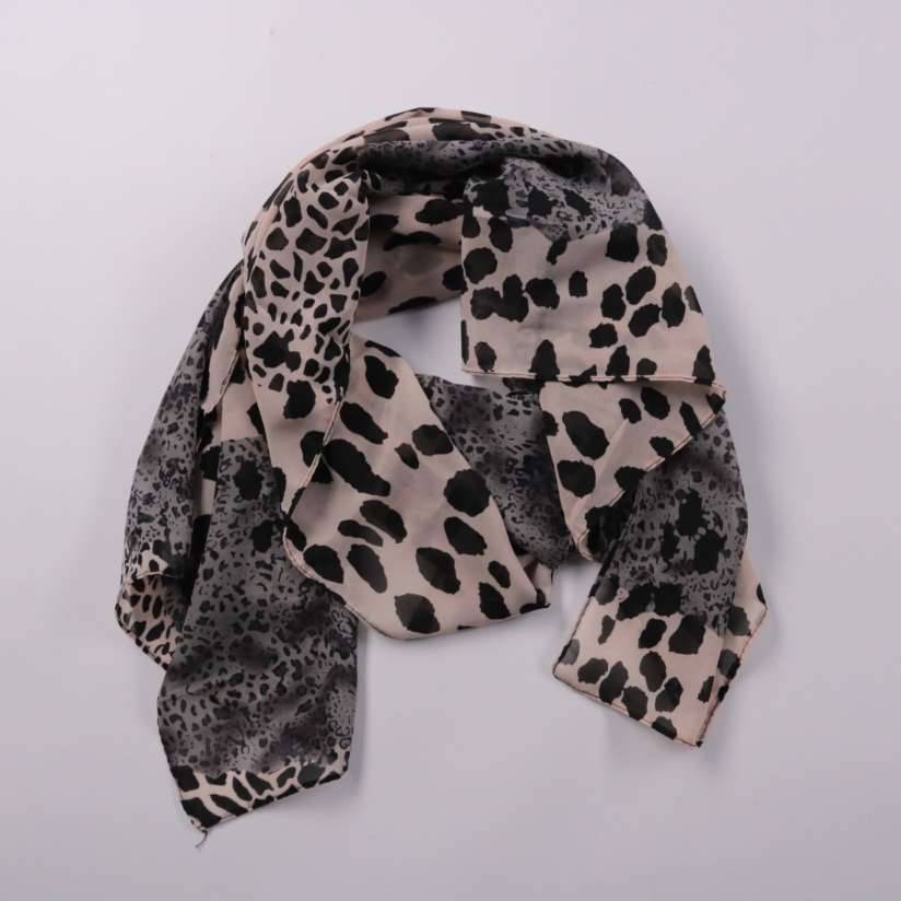 Шарф с анималистичным принтом (леопард) в бежево-серо-чёрной гамме. Подойдёт для повседневных образов и как акцент к однотонной верхней одежде в демисезон и прохладным летом. Лёгкая ткань удобно драпируется и не занимает много места в сумке.