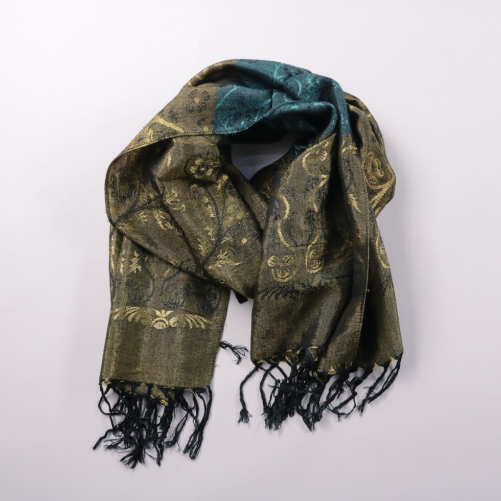Шарф с бахромой и жаккардовым узором в зелёно-золотистой гамме. Подойдёт для демисезона и прохладных вечеров, хорошо смотрится с пальто и куртками. Длинный формат позволяет носить его разными способами и удобно утеплять шею.