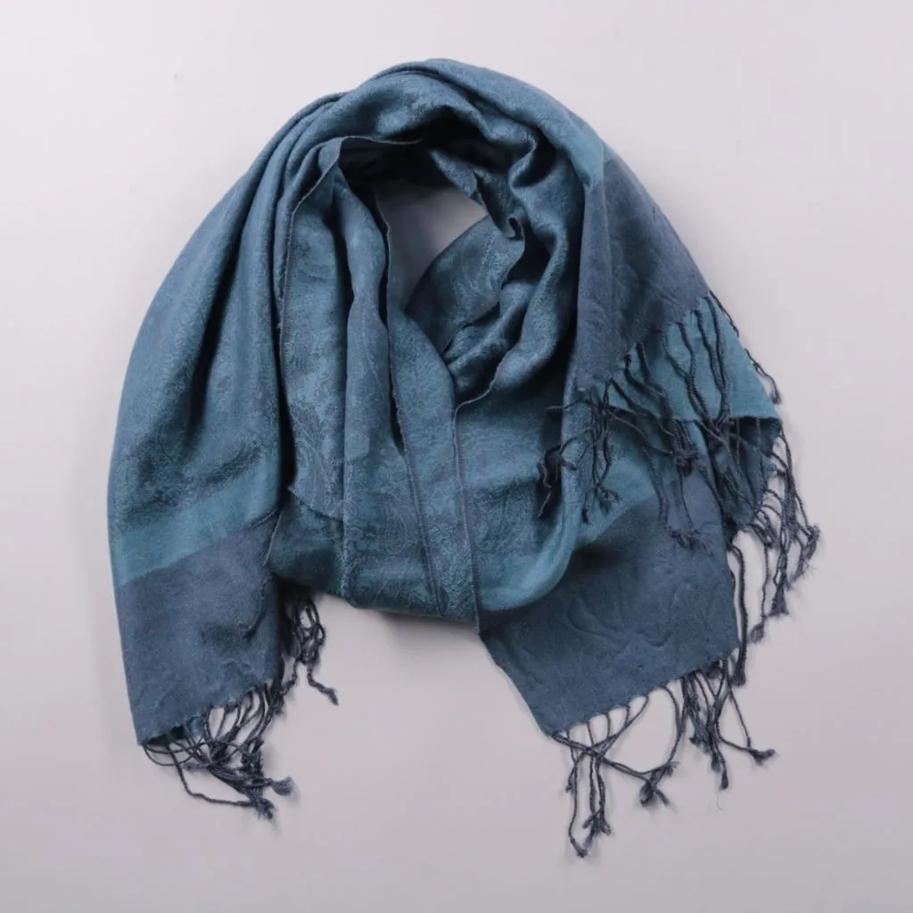 Шарф с бахромой в сине-бирюзовом оттенке, без видимых логотипов. Подойдёт для повседневных образов в межсезонье и прохладными вечерами. Лёгкая ткань удобно драпируется и занимает мало места в сумке.