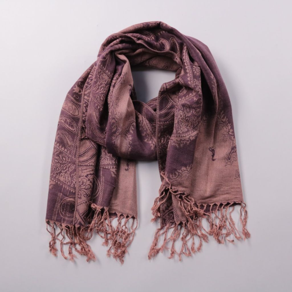 Шарф с орнаментальным принтом в фиолетово-розовых тонах и кисточками по краю. Подойдёт для повседневных образов и поездок в прохладную погоду, можно носить как палантин. Легко драпируется и добавляет тепла без лишнего объёма.