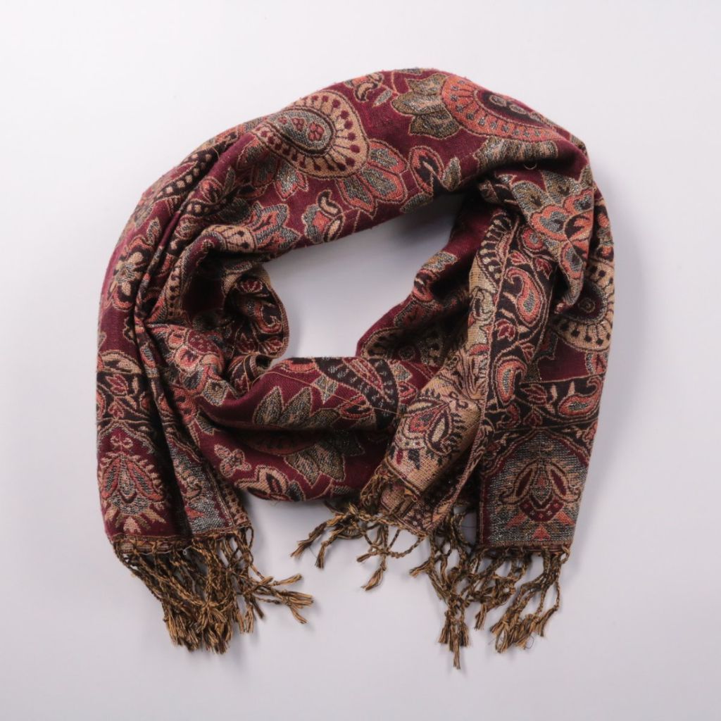 Шарф с узором пейсли в бордовой гамме и кисточками по краям, бренд не указан. Подойдёт для повседневных образов и для прохладной погоды, можно носить как палантин. Практичное преимущество — легко драпируется и добавляет тепла за счёт плотного плетения.