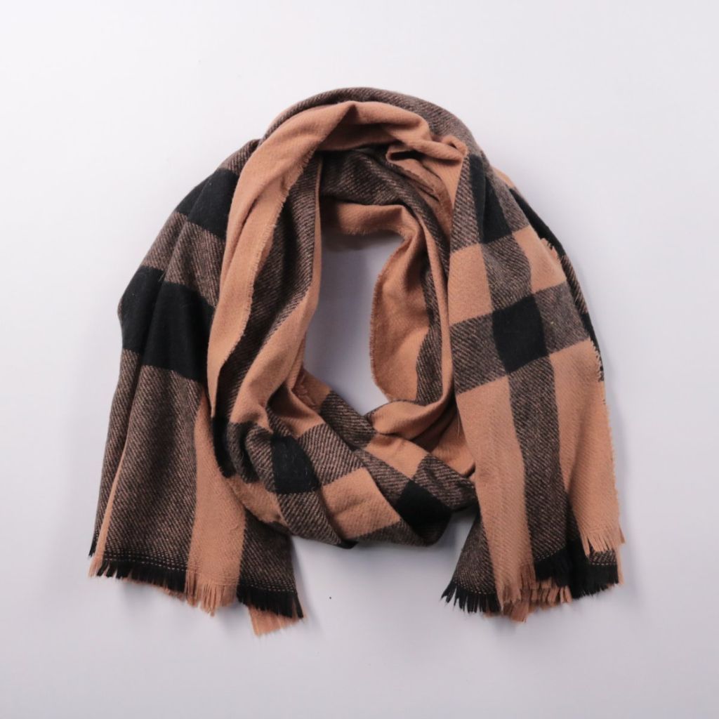 Шарф в крупную клетку бежево-коричневых и чёрных оттенков с бахромой по краю. Подойдёт для повседневной носки и тёплых многослойных образов в холодную погоду. Хорошо закрывает шею и удобно драпируется.