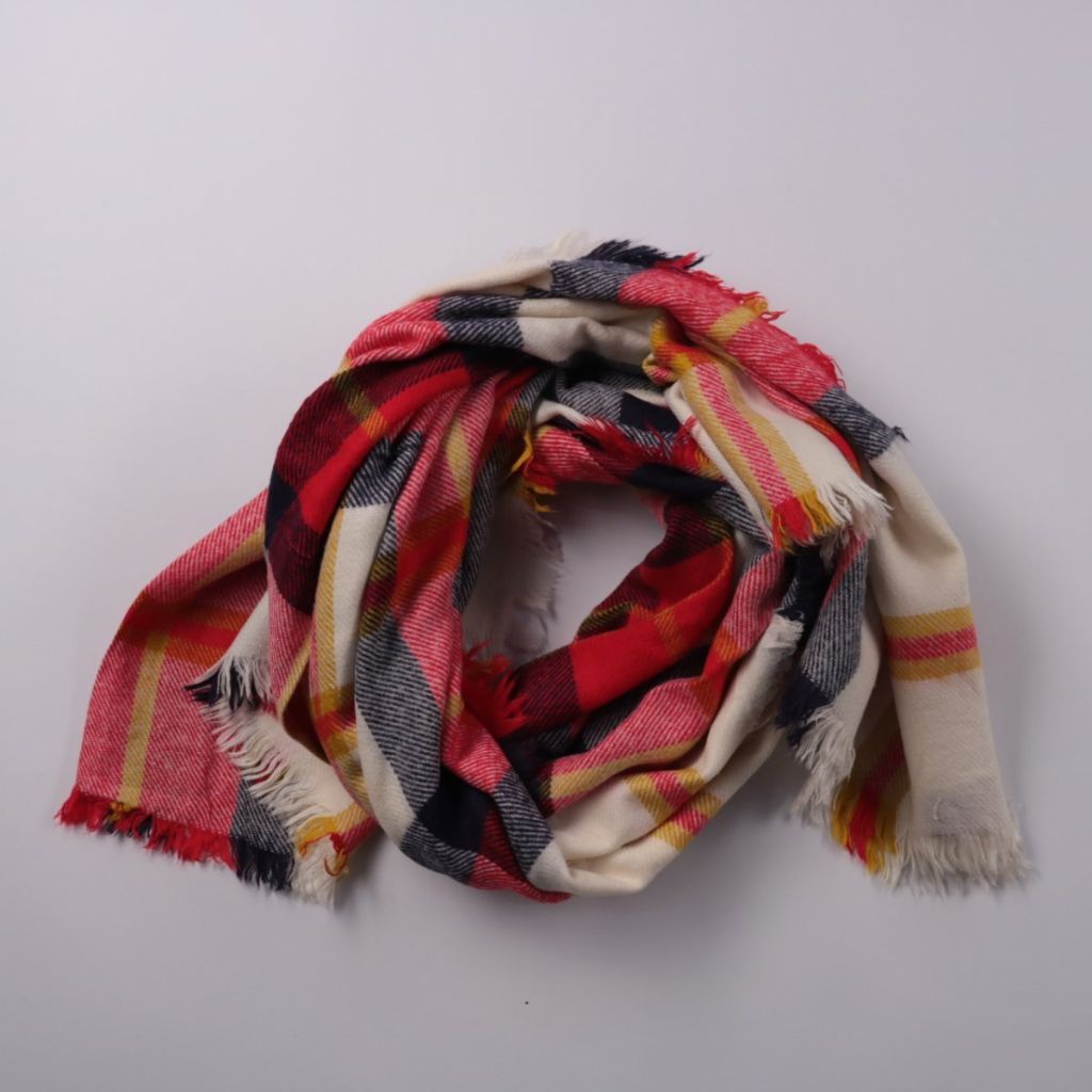 Шарф Jane в клетку с бахромой по краям, мягкий и объёмный. Подойдёт для прохладной погоды и повседневных образов, можно носить как шарф или накинуть на плечи. Акриловая ткань простая в уходе и быстро сохнет.