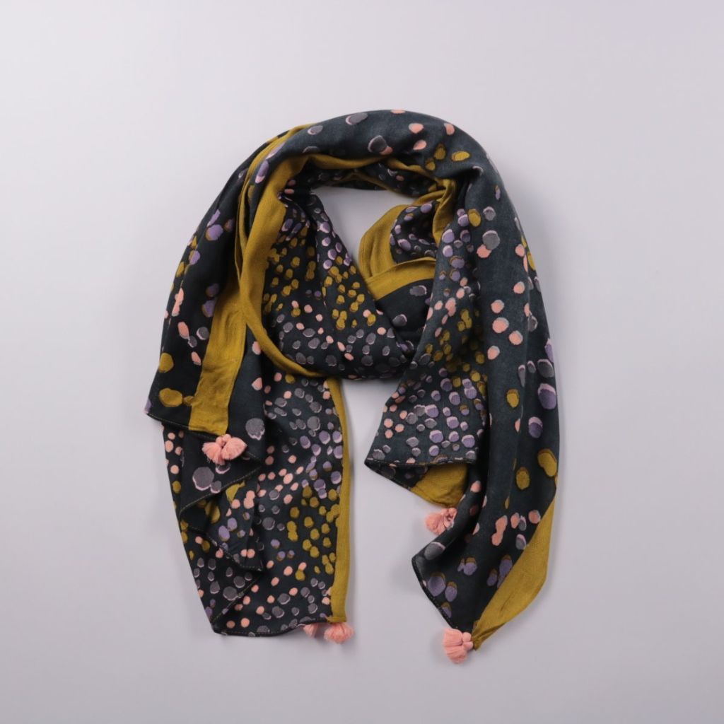 Шарф White Stuff тёмного цвета с принтом в горошек и контрастной горчичной окантовкой, с кисточками по краям. Подойдёт для повседневных образов и как акцент к однотонной верхней одежде в демисезон. Лёгкий материал удобно драпируется и не занимает много...