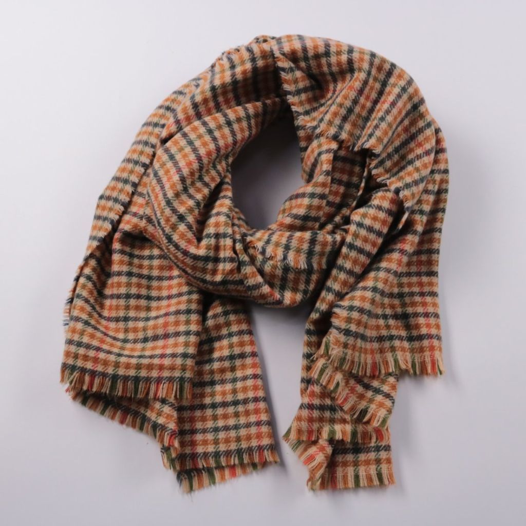 Шарф в клетку с бахромой, без указания бренда. Подойдёт для повседневных образов в прохладную погоду и хорошо сочетается с пальто или курткой. За счёт плотного полотна помогает сохранять тепло и комфортно драпируется.