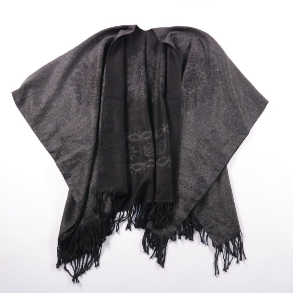 Шарф-палантин тёмно-серого цвета с бахромой и ненавязчивым жаккардовым узором. Подойдёт для повседневных образов в прохладную погоду, можно носить как шарф или накидывать на плечи. За счёт мягкого материала хорошо драпируется и добавляет тепла.
