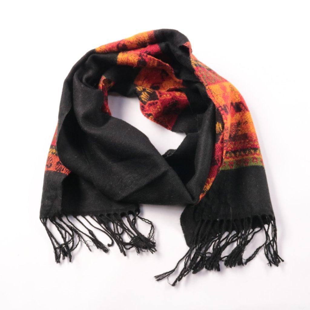Шарф с бахромой в чёрном цвете с контрастным красно-оранжевым орнаментом. Подойдёт для повседневных образов в прохладную погоду, можно носить как шарф или накидывать на плечи. Плотная ткань хорошо сохраняет тепло и защищает шею от ветра.