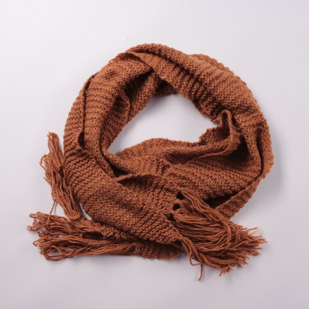 Вязаный шарф без бренда, коричневого цвета, с бахромой по краю. Подойдёт для повседневных образов и прогулок в холодную погоду. За счёт плотной вязки хорошо сохраняет тепло и комфортно носится на шее.