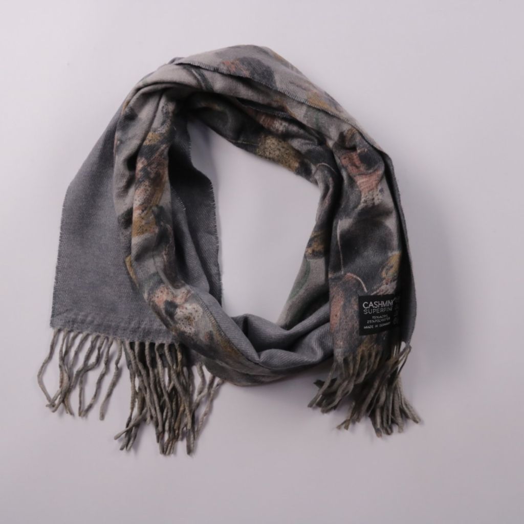 Шарф Cashmink Suprefine серого цвета с цветочным принтом и бахромой по краю. Подойдёт для повседневных образов в прохладную погоду, можно носить как на пальто, так и на куртку. Практичное преимущество — мягкий материал и простой уход благодаря составу ...