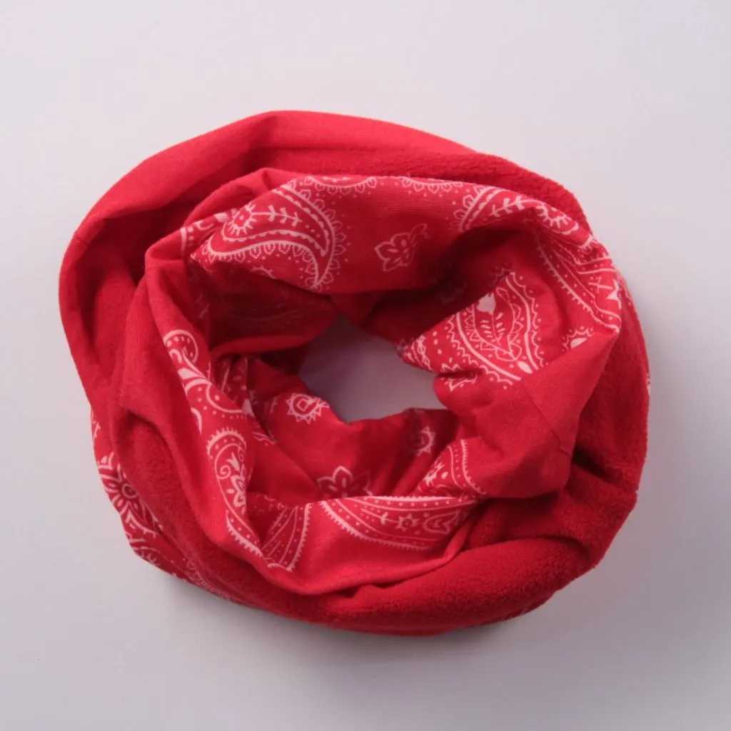 Снуд без бренда красного цвета с принтом пейсли, выполнен в формате «трубы». Подойдёт для прогулок и активностей в прохладную погоду, можно носить на шее или как лёгкий бафф. Практичен тем, что не развязывается и хорошо закрывает горло от ветра.