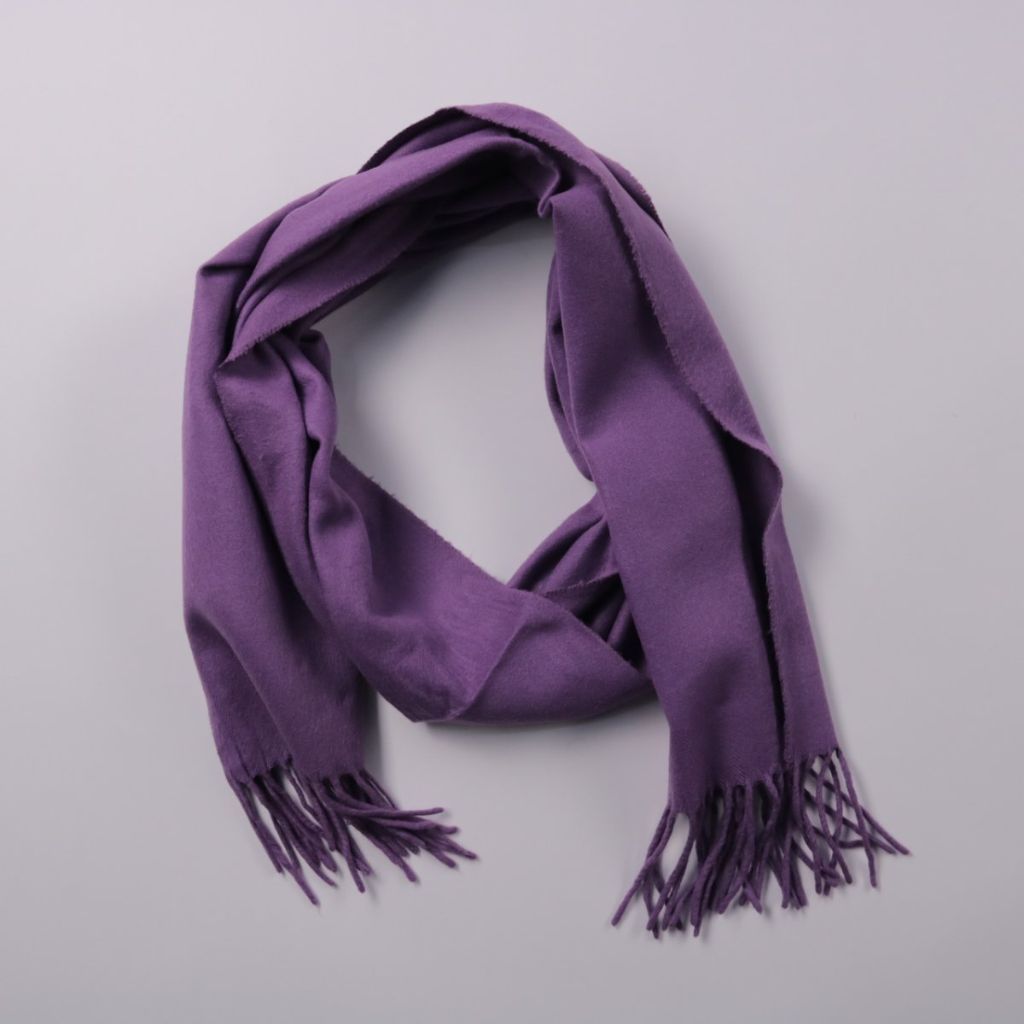 Шарф без бренда фиолетового цвета с бахромой по краям. Подойдёт для повседневной носки в прохладную погоду и легко сочетается с пальто или курткой. Удобно драпируется и добавляет тепла в области шеи.