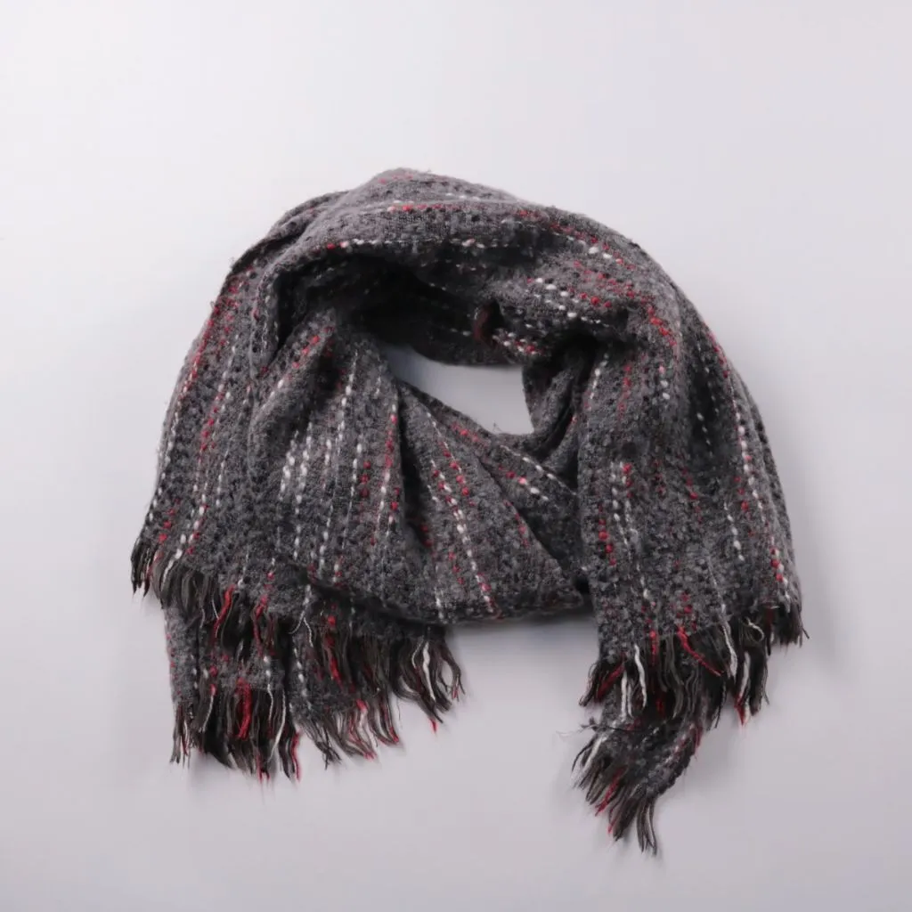 Шарф s.Oliver серого цвета с фактурной пряжей и вкраплениями красных и белых нитей, с бахромой по краям. Подойдёт для повседневных образов и для прогулок в холодную погоду. Объёмный материал хорошо сохраняет тепло и удобно драпируется.