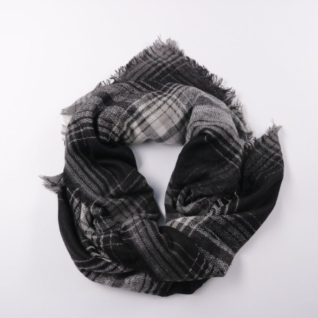 Шарф в клетку в чёрно-серой гамме с необработанным бахромчатым краем. Подойдёт для повседневных образов и офисного стиля в прохладную погоду. Легко драпируется и добавляет тепла без лишнего объёма.